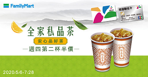 全家FamilyMart的優惠-全家-悠遊卡友消費優惠活動,持悠遊卡/悠遊聯名卡每週四購買私品茶, 享第二杯半價優惠,任選品項皆可