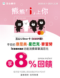 iCash的優惠-熊熊「i」上你,平日於康是美/星巴克/麥當勞持玉山UBear卡(icash版)以icash2.0功能消費,享8% OPEN POINT點數回饋 ※單筆消費需達100元(含)以上 ※每月每卡回饋上限300點