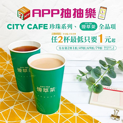 7-ELEVEN (7-11)的優惠-7-11 APP抽抽樂CityCafe、現萃茶最低1元起,7-11 APP抽抽樂 買CityCafe珍珠系列、現萃茶全品項任2杯就能抽 最低1元起