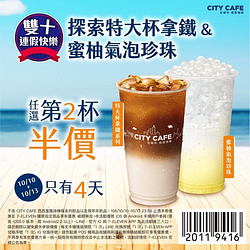 7-ELEVEN (7-11)的優惠-7-11 CITY CAFE特大杯拿鐵、蜜柚氣泡珍珠任選第二杯半價,只有4天!7-11與你一同歡慶雙十連假~ CITY CAFE特大杯拿鐵、蜜柚氣泡珍珠任選第二杯半價