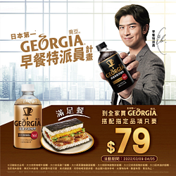全家FamilyMart的優惠-Georgia喬亞咖啡 搭配指定品項 只要79元,專屬推薦全家滿足餐 購買Georgia喬亞咖啡,搭配指定品項,只要79元 活動指定品項: 大口焙煎咖哩牛肉飯糰、大口宮保雞丁飯糰、大口香蔥鹽麴雞腿飯糰、大口燒豚烤雞雙拼飯糰、大口叉燒香腸雙拼飯糰、大口經典滷排飯糰 泡菜燒肉飯卷、韓式牛肉飯卷、經典雙牛起司堡、美式雞腿堡、焙煎咖哩漢堡排堡。