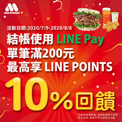 摩斯漢堡MOS的優惠-MOS用LINE Pay結帳最高享10%點數回饋,到摩斯漢堡使用LINE Pay結帳,單筆滿200元,最高享LINE POINTS 10%回饋!